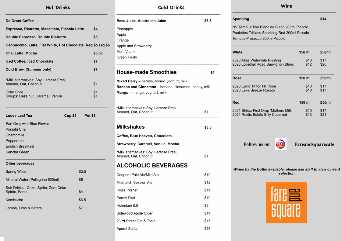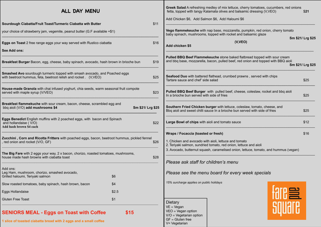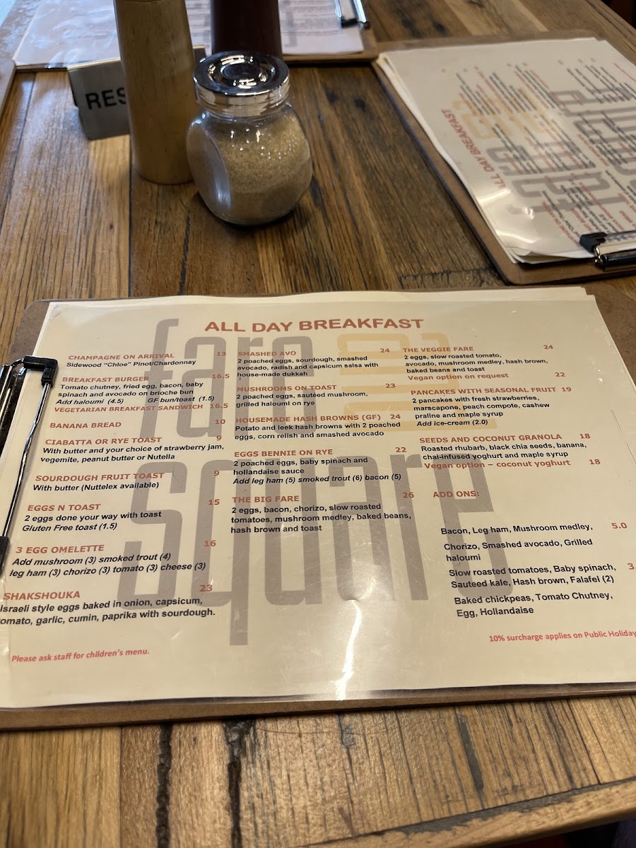Welcome to Fare and Square, a charming café nestled in the heart of North Adelaide. With a delightful all-day menu, they offer a range of hearty options perfect for brunch lovers. Start your day with their Eggs on Toast, showcasing two free-range eggs paired with Rustico ciabatta for an unbeatable A$16.00. For those craving something more substantial, the Breakfast Burger features bacon, egg, cheese, and avocado nestled in a brioche bun, priced at A$19.00.